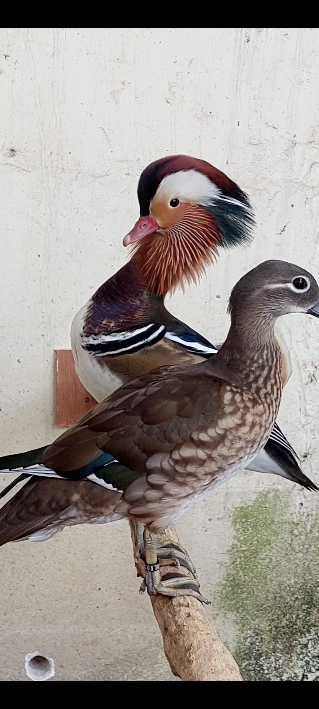 Bebek mandarin adalah salah satu jenis unggas air yang lebih mungil, dengan tinggi badan yang lebih pendek dan ukuran tubuh yang lebih kecil secara keseluruhan daripada bebek dabbling, dan sedikit lebih kecil daripada bebek kayu Amerika. Jantan dewasa memiliki paruh mungil berwarna merah, bulan sabit putih besar di atas mata dan wajah serta "kumis" kemerahan. Dada jantan berwarna ungu dengan dua garis putih vertikal, sisi-sisinya berwarna kemerahan.